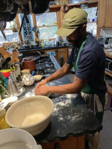 My enthusiastic students were starting from scratch as they had not baked a loaf before. Under my gentle prodding, each person stirred, kneaded, and shaped a lovely loaf. And we made Onion Naan on the griddle for our lunch.